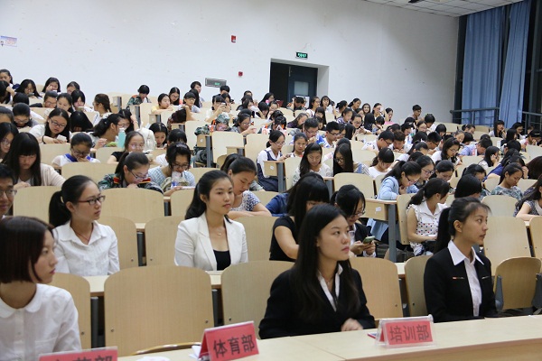 团委学生会在9号教学楼201举行了招新宣讲会,可容纳数百人的教室座无虚席,2015级新同学对即将开始的宣讲会充满期待。
