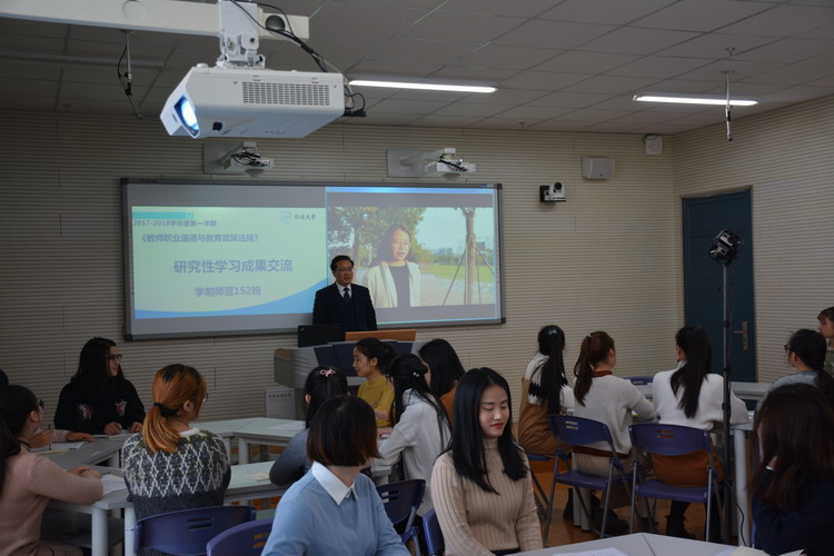 教学伊始,许映建老师利用手机慕课与同学们一起回顾了该课程的教学大纲,他让学习委员王娜组织同学们进行研究性学习成果展示。然后,张刘丽、周凯和严靓丹三位同学依次利用PPT和视频展示了他们小组对《教师仪容规范》、《学生的权利保护》、《教师的举止规范》三大课程要点的研究性学习成果,结合当今幼儿教师现状分别提出问题。最后,许映建老师夸奖了同学们完成作业的态度和作业质量,指出该课程的重要性,是师范生的专业基础必修课程,是国家教师资格考试和教师应聘考试的必考内容,更是教师必备的素养要求。
