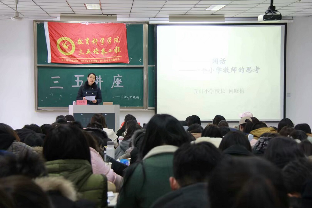 2018年3月21日下午,成人电影 于8号教学楼208教室举办了题为“小学教育深思浅谈”的三五讲座。本次讲座邀请了五山小学校长何晓梅老师为主讲人,教科院160余名小学教育专业学生到场听讲。