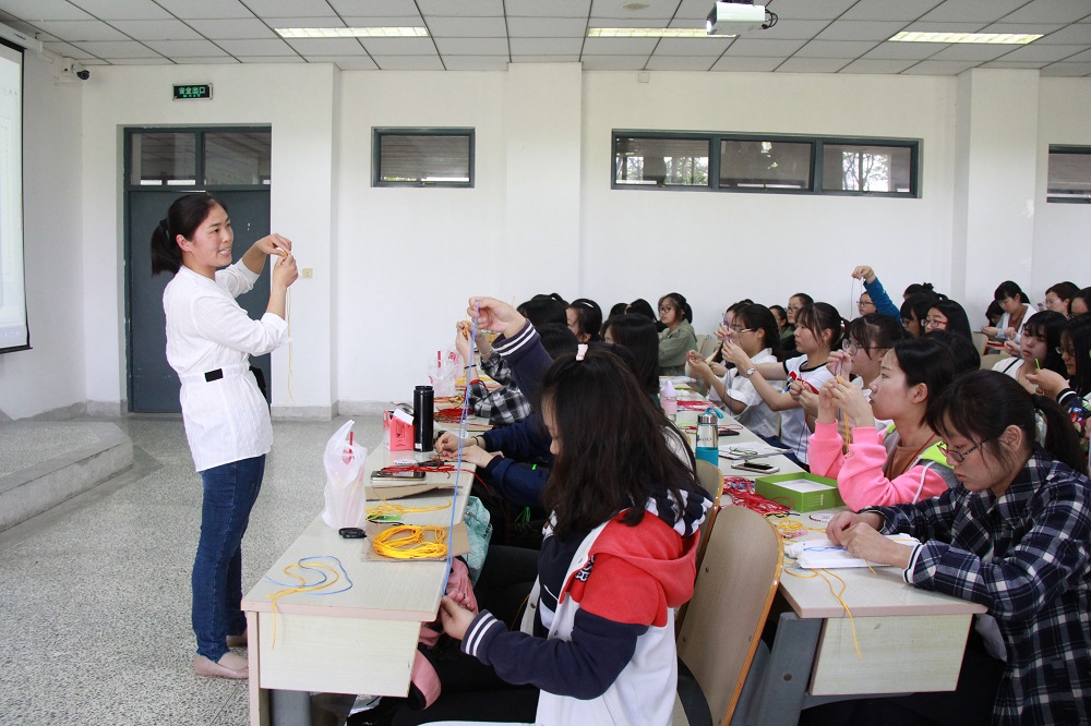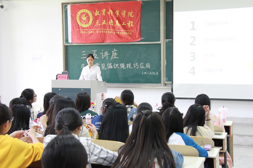 5月9日14:00,成人电影 于8号教学楼102教室成功举办了三五讲座之“几种常用的编织绳技巧”。本次讲座由民间艺人赵敬波老师主讲,教科院100余名学生到场参与此次讲座。