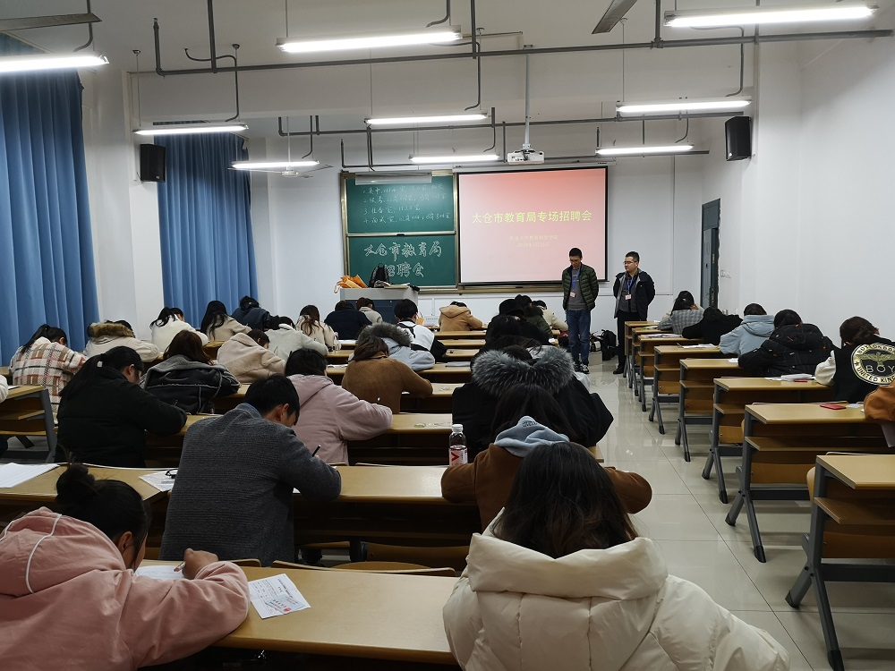 2019年3月23-24日,成人电影 在18号教学楼1112等教室举办太仓市教育局专场招聘会,太仓市教育局副局长张跃忠率队前来,成人电影 党委副书记徐红波进行了接待并考察招聘会现场,来自院、成人电影 、江苏师范大学等学校的同学进行了为期两天的招聘考试。