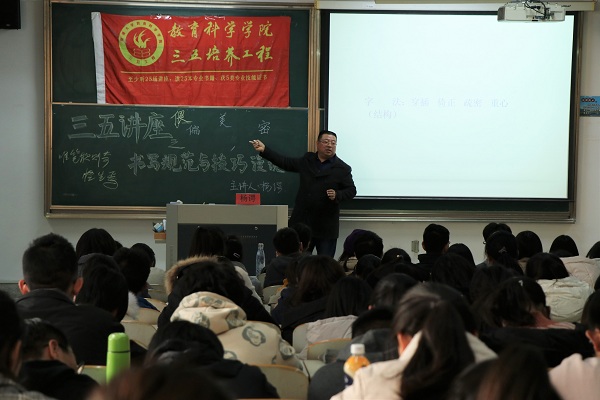 12月4日下午,成人电影 于8号楼309教室举办以“书写规范与技巧漫谈”为主题的三五讲座。讲座由杨谔老师主讲,教科院280余名学生到场参加。