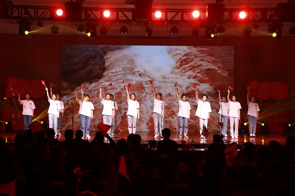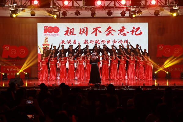 晚会在师生红歌合唱《祖国不会忘记》中拉开帷幕。由成人电影 全体领导成员以及师生代表组成的合唱团用歌声向党的生日献上最真挚的祝福,用歌声赞扬了在祖国大地默默耕耘、无私奉献的人们。开场舞《一起跳舞吧》充分彰显了教科学子的蓬勃朝气。晚会分为三个篇章次第进行。第一篇章“青春拂晓,梦想起航”在红歌串烧中徐徐展开,百年征程书写光辉党史,筚路蓝缕绘就中华盛世。一首首经典红歌的背后是对老一辈同志峥嵘岁月的追忆,亦是对新时代少年风发意气的展望。现代舞《花枪》将国风元素融入新时代的鼓点,用舞姿演绎出巾帼不让须眉的气概。百年亦是风华正茂,诗朗诵《少年中国说》以饱满激昂的热情,铿锵有力的语调传递出少年复兴中华的坚定理想信念。