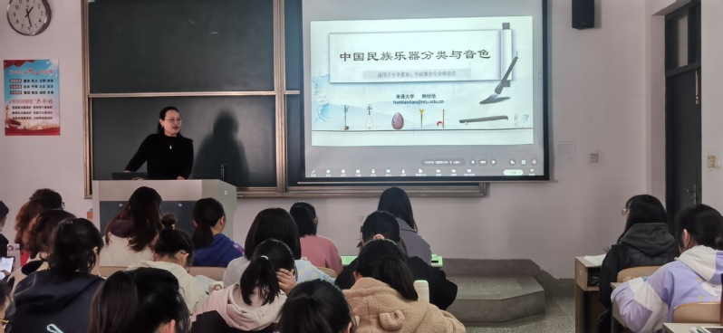 11月12日下午,教科院韩恬恬副教授开设教授公开课。学前教育系主任吉兆麟教授以及青年教师观摩了的本次示范课。授课内容为中国民族乐器课程采用线上线下混合式教学,课前学生在大学慕课平台学习微课视频,线下课堂通过随堂测验、主题研讨,强调学生自主探究、表演唱等音乐实践以及对作品意蕴的理解与情感深华课堂上,韩老师首先通过课堂派在线练习,现场实时分析答题数据,进行问题解答,梳理难点。其次,以问题主导,通过案例探究中国民族乐器造型的寓意美与理性美接着,由分析走向体验,层层递进,三探音色美学生通过诗歌朗读,旋律模唱,体验乐器音色特征。最后欣赏视频用发送弹幕的形式描述吹管乐器音色的性格美在课堂总结环节,韩恬恬老师说中国民族乐器被全世界的人们所喜欢。习总书记说过文化没有高低之分,却有姹紫嫣红之别,丰富多彩的中国民族乐器为姹紫嫣红的人类音乐文化增添了一抹亮色,这是我们中华民族的自豪”,将学生对于中国民族文化的自豪之情推向高潮。