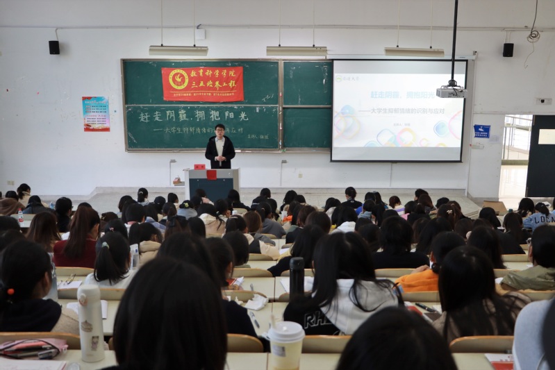 在9号教学楼303教室举办了以“赶走阴霾,拥抱阳光——大学生抑郁情绪的识别与应对”为主题的三五讲座。此次讲座由张恒老师主讲,教科院260余名学生参加。