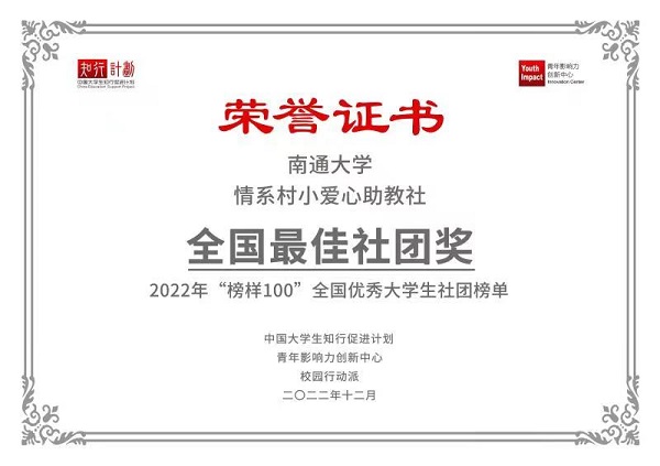 2022年“榜样100”全国优秀大学生社团榜单 正式发布。来自清华大学、北京大学、复旦大学、上海交通大学等170余所高校、590+社团/团队、360+优秀大学生上榜。成人电影 “情系村小爱心助教社”和“情境教育研究会”两支社团入围榜单。