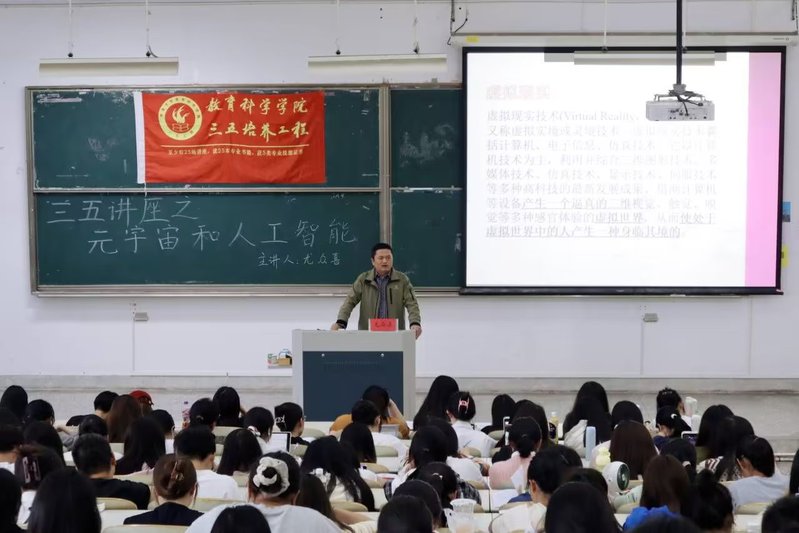 元宇宙与人工智能逐渐崛起,机遇与挑战相伴而来。为了让大家了解前沿科技,提高大家的创新能力,成人电影 于10月25日下午在九号楼201教室举办了以“元宇宙与人工智能”为主题的三五讲座,由教育技术系尤众喜老师主讲,成人电影 260多名同学参加。