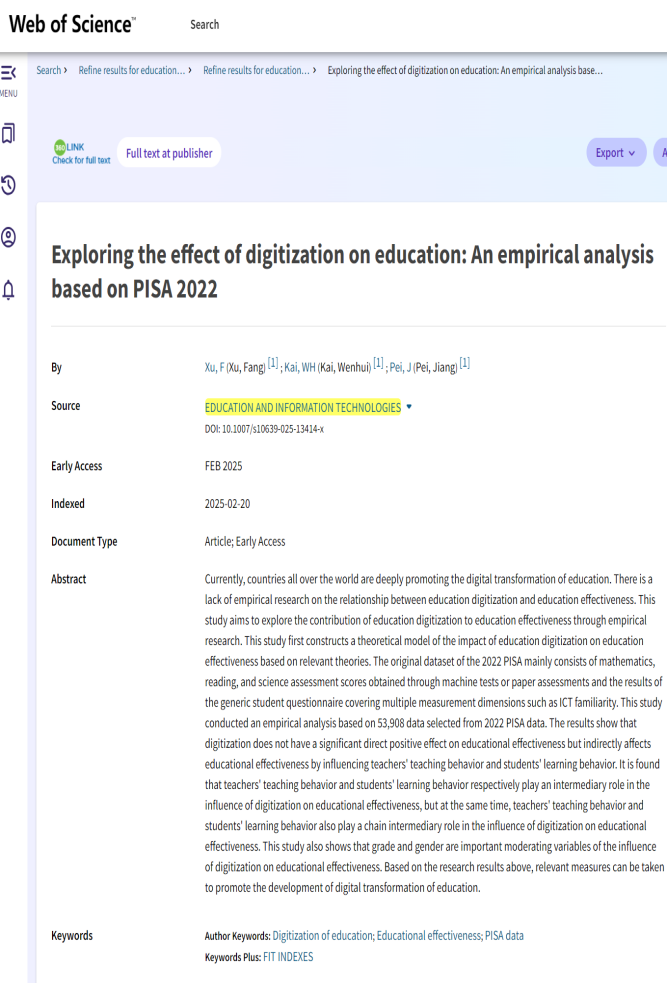 近日,成人电影 方旭副教授及其团队研究成果获国际权威期刊认可,其撰写的39页长篇论文《Exploring the Effect of Digitization on Education: An Empirical Analysis Based on PISA 2022》发表于SSCI教育学一区期刊《Education and Information Technologies》。该研究基于PISA 2022数据,系统解析数字化进程对教育发展的影响机制。