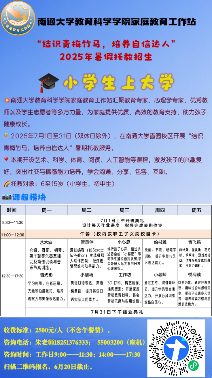 时间地点:2025年7月1日至31日(双休日除外),在成人电影 啬园校区(啬园路9号)开展“结识青梅竹马,培养自信达人”暑期托教服务。