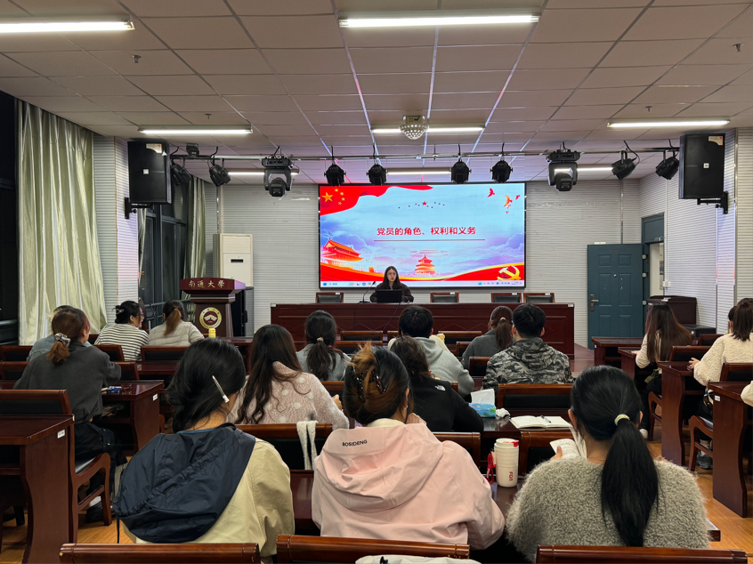 学院研究生第一党支部书记刘翼老师以《党员的权利和义务》为题开展专题报告。她从共产党员的基本条件、角色定位、责任担当以及权利保障和义务履行三个维度进行解读,帮助同学们全面、深刻地理解党员权利和义务。