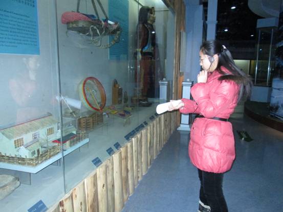 在塔城红楼博物馆为参观者讲解民俗展厅图为达斡尔族生活用具模型