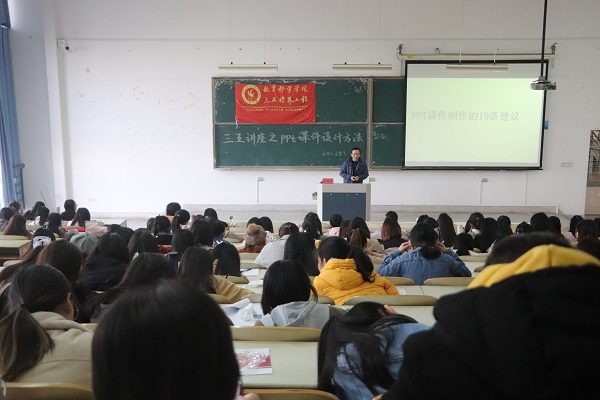 11月28日下午14:00,成人电影 在9号楼202成功举办了以“PPT课件制作方法”为主题的三五讲座。本次讲座由王雪飞老师主讲,教科院全体16级小学教育专业学生参加了此次活动。