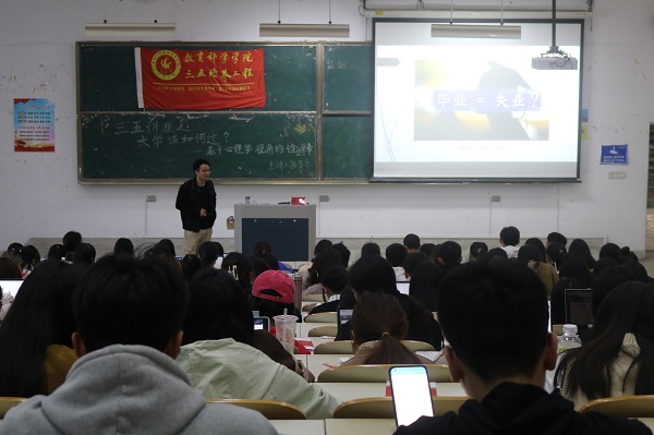 为拓宽学生的知识和学术视野,提高学生科学文化与人文素养,规划更有意义的大学生活,成人电影 于11月2日在九号教学楼202教室举办以“大学该如何过?——基于心理学视角的诠释”为主题的“三五”讲座。讲座由陈乐乐老师担任主讲老师,成人电影 的260余名同学参加了讲座。